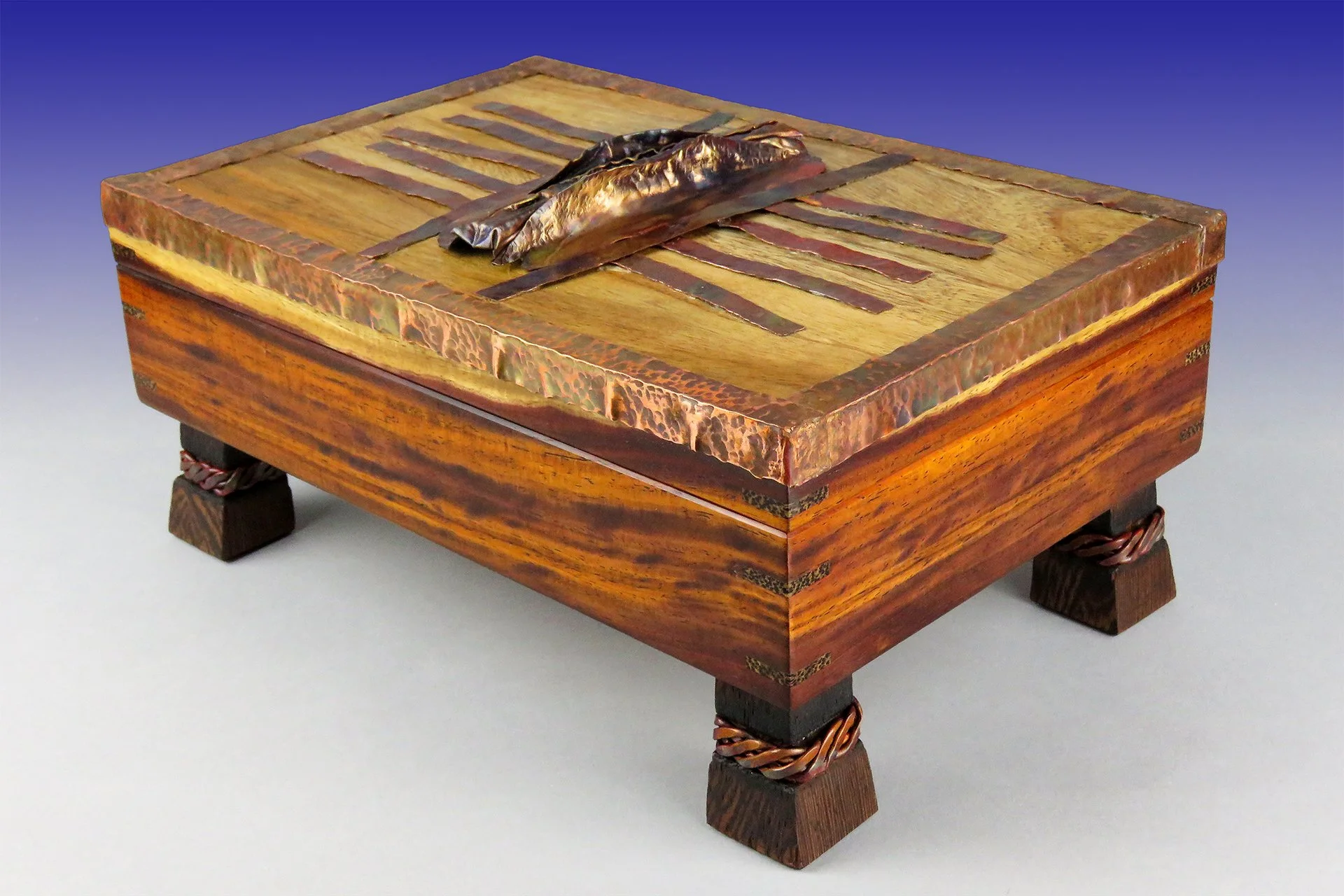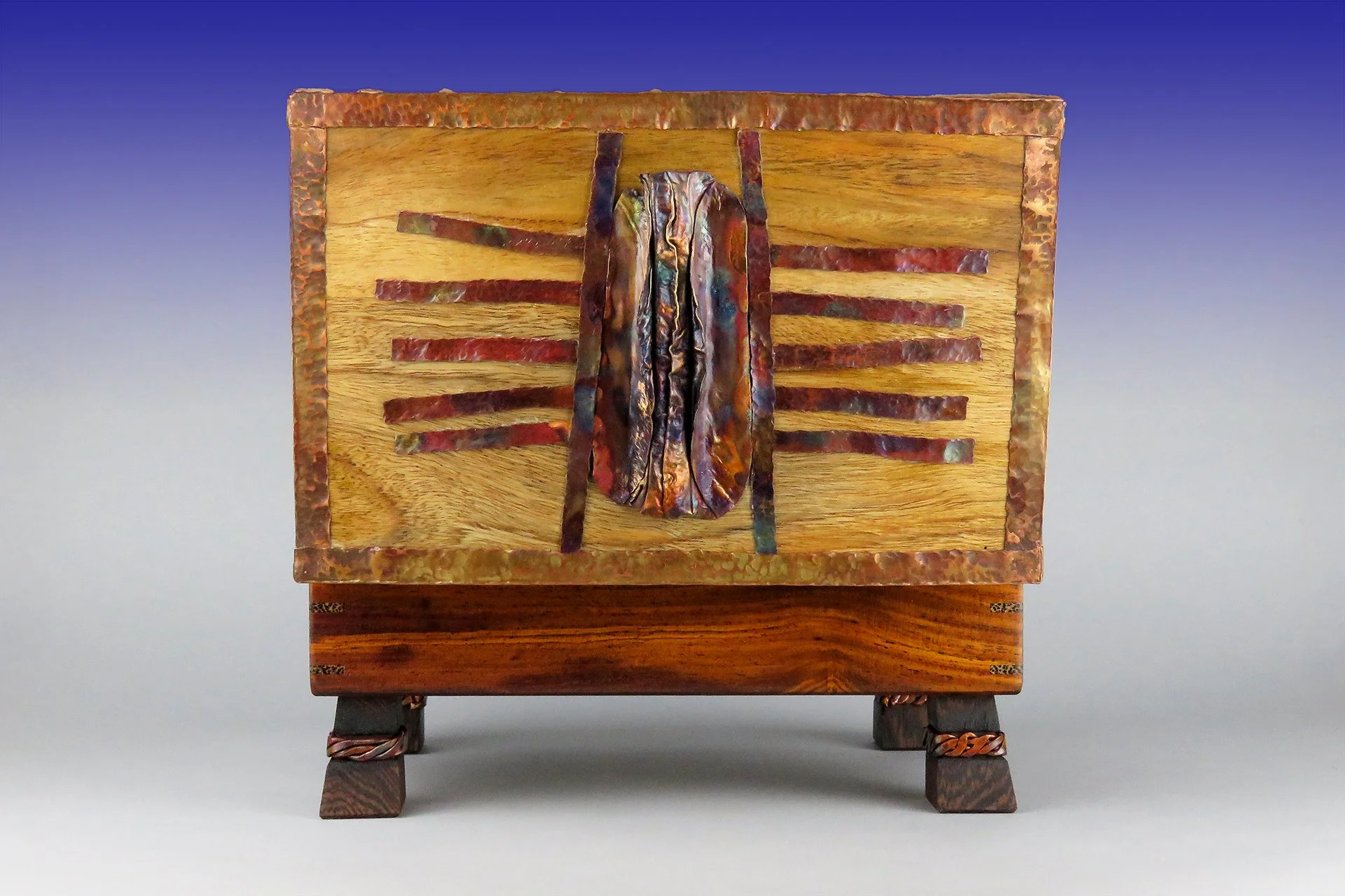 Embellished with copper (chased, forged, braided and flamed)